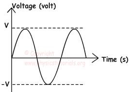 No gráfico acima, temos a relação entre o tempo e a tensão em corrente alternada. Dá prá ver que a tensão fica variando, num mesmo fio, entre +220V e -220V, passando por 0V no meio do caminho. Isso significa, grosso modo, que a tensão se alterna entre "indo e voltando" pelo fio. O caminho percorrido de 0V até o próximo 0V corresponde a meio ciclo, ou seja, duas passagens pelo eixo X compõem um ciclo.